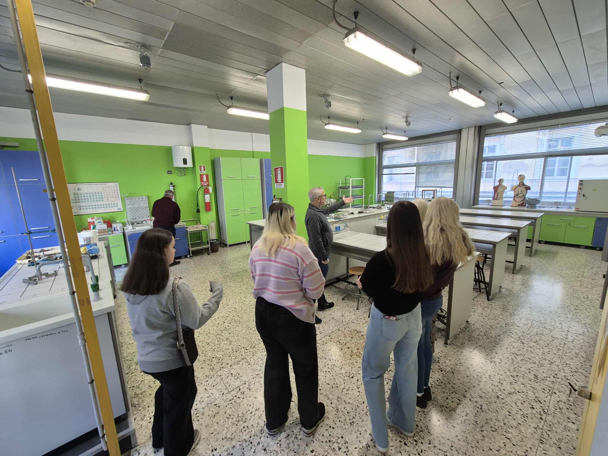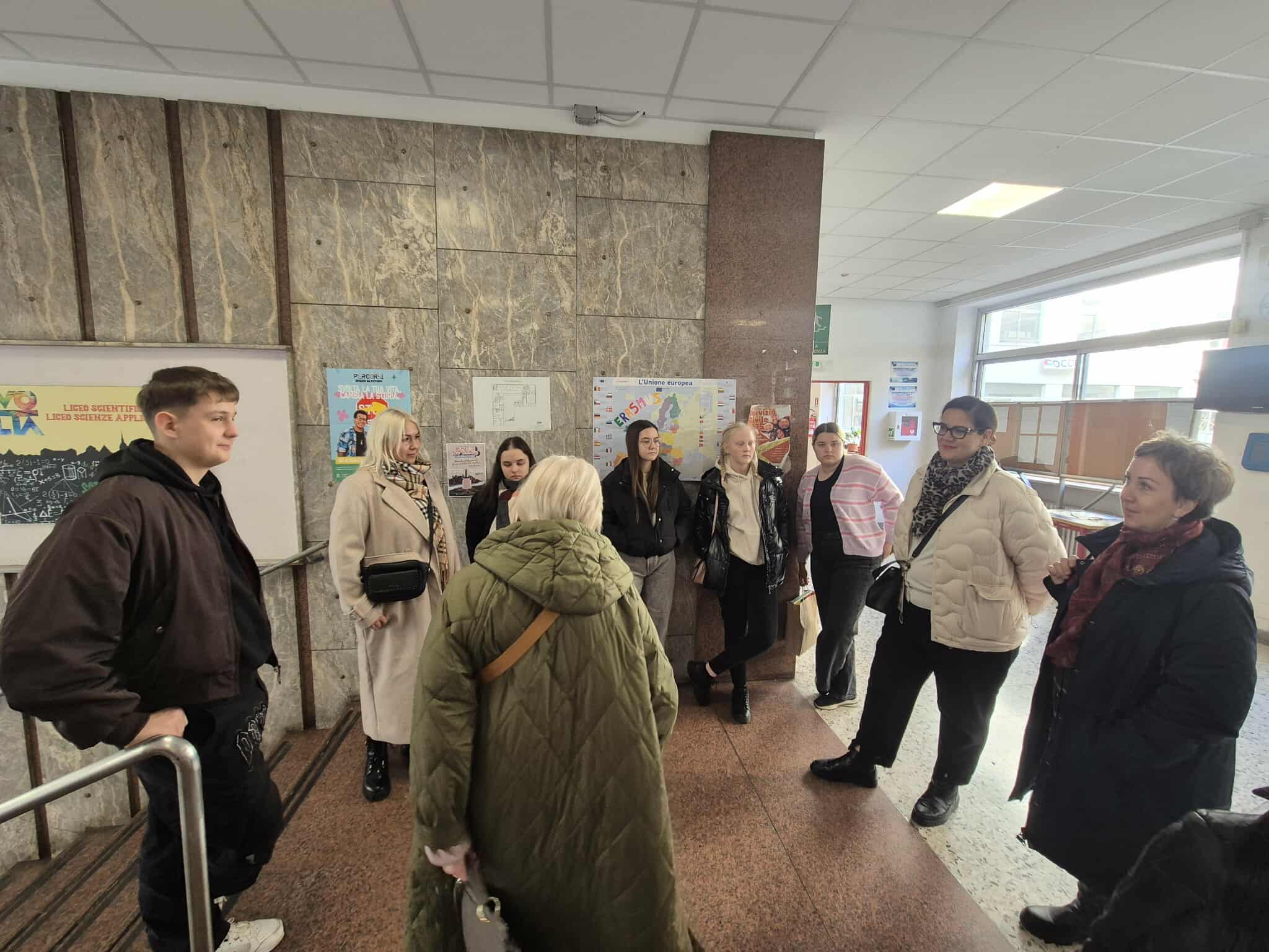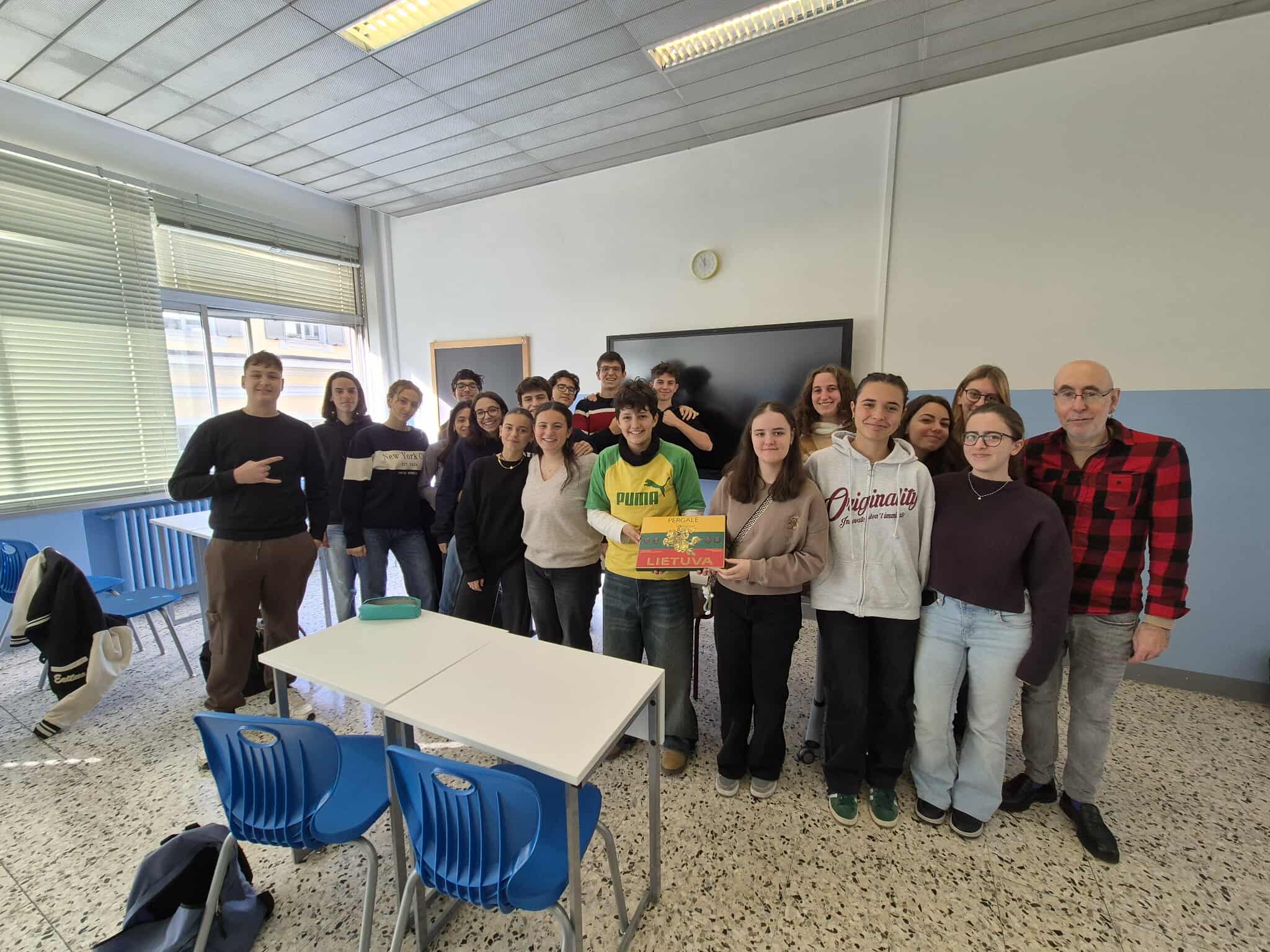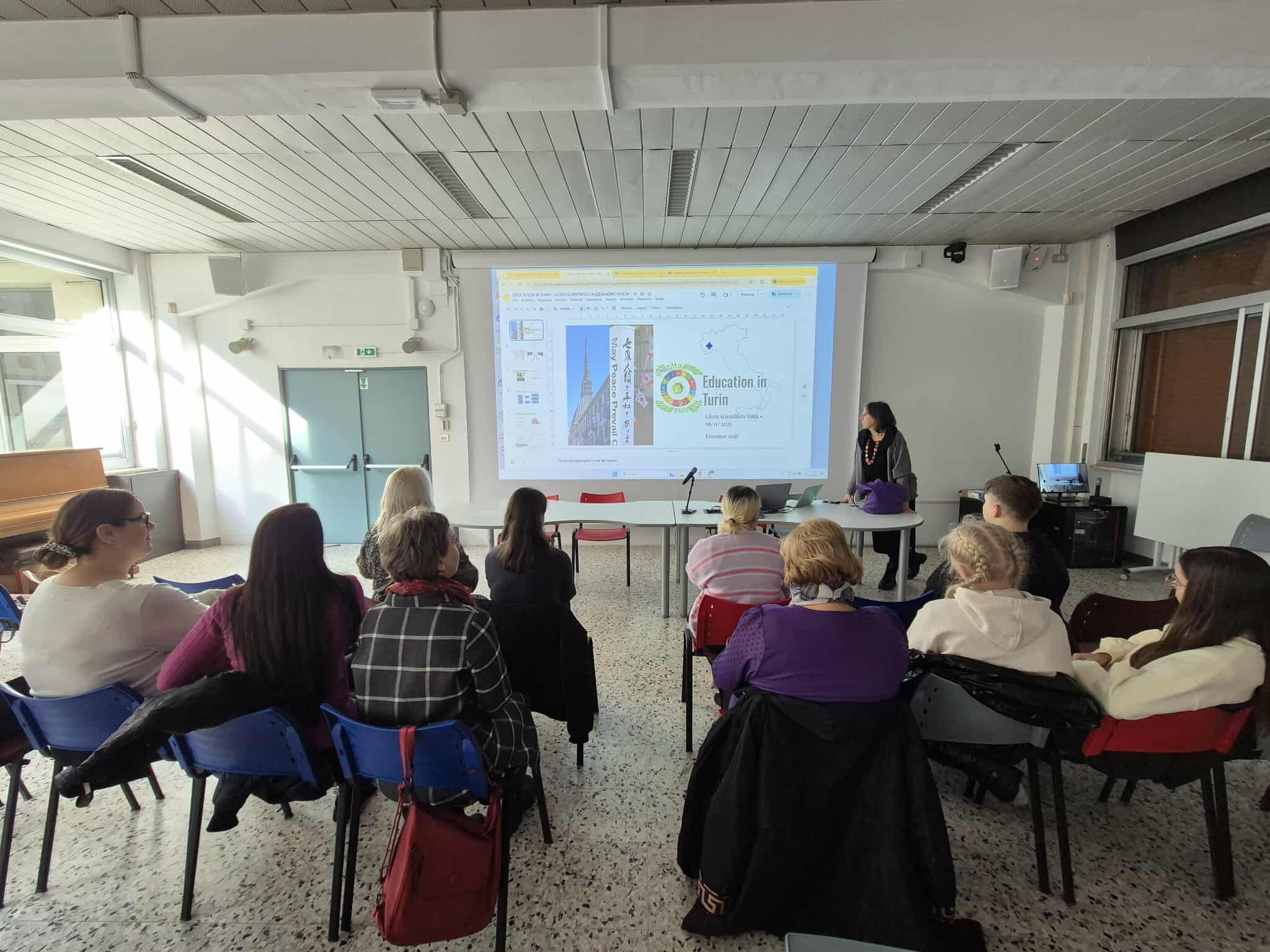 Erasmus+ programos projekto mokiniai dalyvavo prestižinio Liceo classico “Vincenzo Gioberti” (Turinas) ugdymo veiklose. Licėjus įkurtas XIX a. pabaigoje; pavadintas žymaus italų filosofo, politiko Vincenzo Gioberti garbei. Licėjus garsėja savo humanitarine tradicija, akademine reputacija ir istorine aplinka. Pastatas yra istorinis, būdingas Turino tradicinei architektūrai: aukšti koridoriai, senos klasės su originaliomis medinėmis detalėmis. Licėjuje stiprus humanitarinių mokslų (lotynų, graikų kalbų dėstymas), daug pamokų vyksta anglų kalba. Be to, svarbu paminėti licėjaus ryšį su Turino universitetu: licėjaus absolventai renkasi studijas klasikiniame Turino universitete, kuris įsikūręs kitoje nuo licėjaus gatvės pusėje. (P.S. buvodami Turino mieste projekto dalyviai matė išskirtinai pasipuošusius universiteto absolventus: ant galvų dėvinčius vainikus – universiteto baigimo simbolį). Projekto dalyviai keletą dienų dalyvavo anglų kalbos pamokose. Patys pristatė Lietuvą, kultūrą, kultūrinį paveldą, pomėgius, diskutavo aktualiomis tvarumo, gamtosauginėmis temomis. Pristatė Lietuvos televizijos sukurtą filmą apie Lietuvą bei padovanojo filmo įrašą (USB formatu).