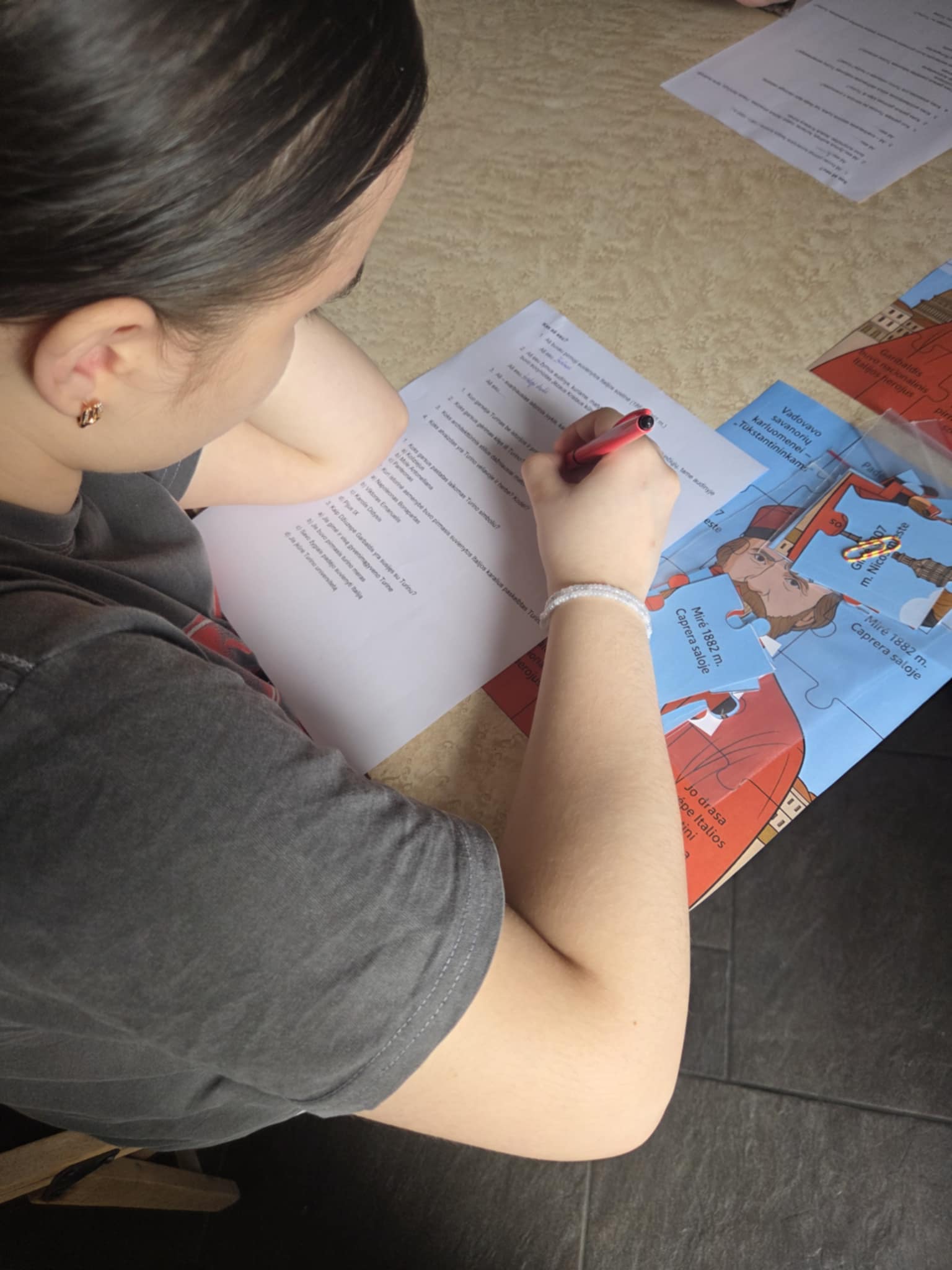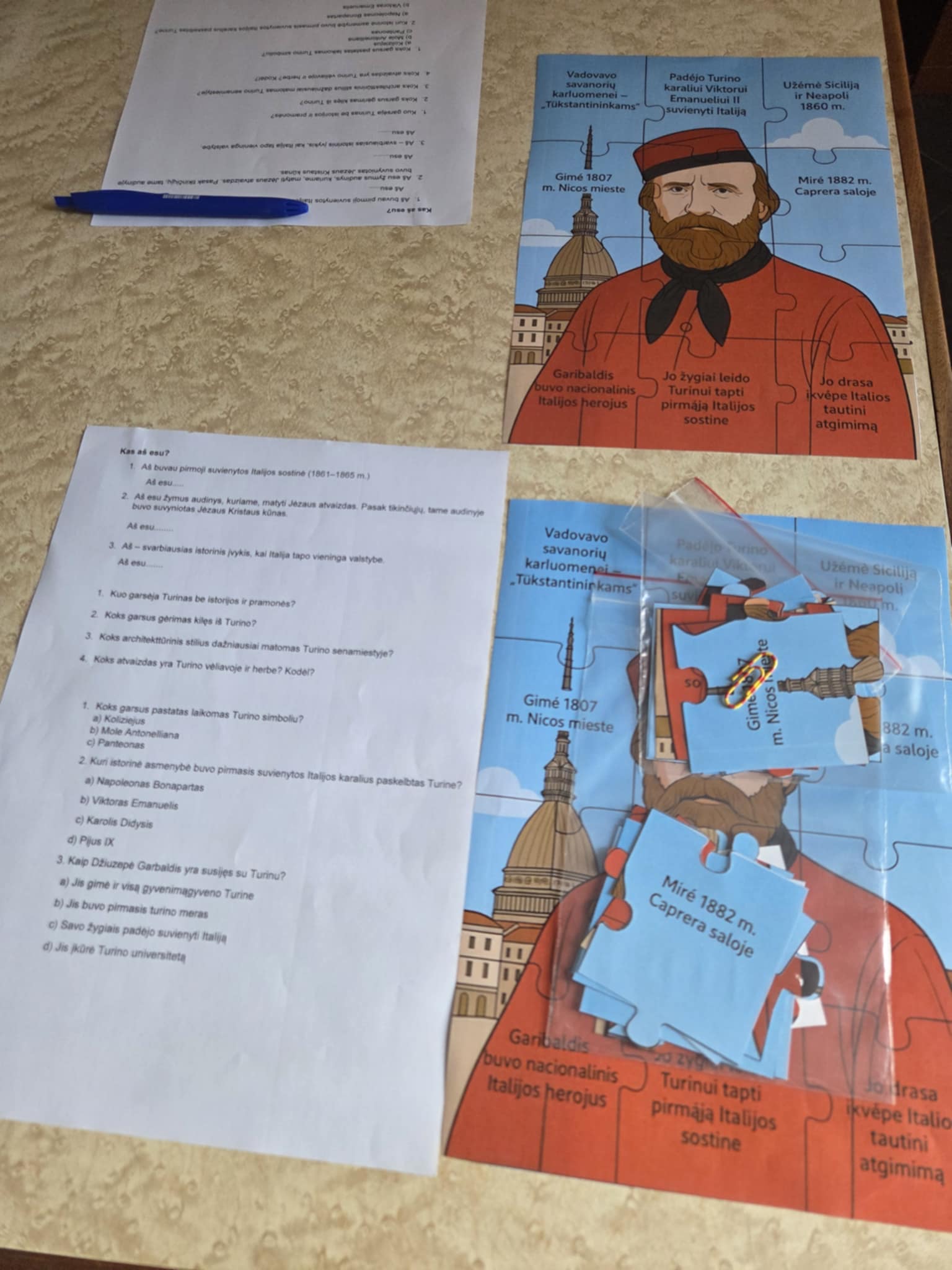 Mokytoja Jovita Kveselienė mokinius į Erasmus+ programos projektą Turine išlydėjo ne tuščiomis rankomis: vežėmės istorijos užduočių – testą ir dėlionę. Mokiniai noriai ieškojo informacijos, prisiminė Milano ir Turino lankytas vietas ir objektus. Labai smagu, kad patyriminis ugdymas teikia vertę ir prasmę. Atlikę užduotis mokiniai įsivertino ir šypsojosi – pavyko!